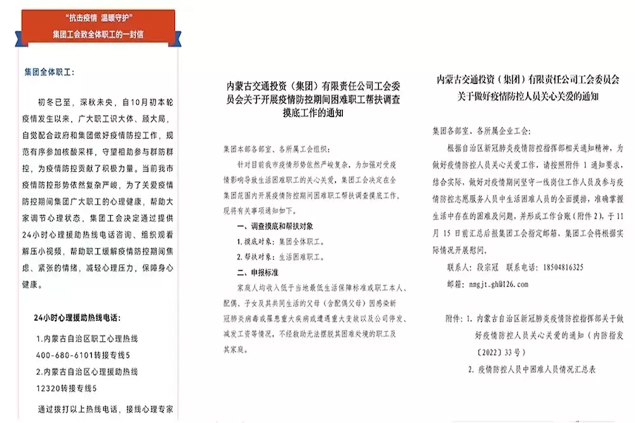 為詳細(xì)掌握志愿者和值班值守人員的工作情況和身體狀況,集團(tuán)工會(huì)建立了志愿者、值班值守人員信息臺(tái)賬,并進(jìn)行動(dòng)態(tài)實(shí)時(shí)更新,有針對(duì)性的送去了防疫急救包和生活物資。同時(shí),在全集團(tuán)范圍內(nèi)開(kāi)展疫情防控期間生活困難職工和生活困難疫情防控人員的全面調(diào)查摸底,通過(guò)視頻形式與困難職工面對(duì)面溝通,詳細(xì)了解致困原因,切實(shí)幫助解決實(shí)際困難,并指導(dǎo)所屬企業(yè)工會(huì)有針對(duì)性的開(kāi)展慰問(wèn)工作;關(guān)注疫情防控期間職工心理健康,開(kāi)展“抗擊疫情、溫暖守護(hù)”活動(dòng),通過(guò)提供24小時(shí)心理援助熱線咨詢電話,組織觀看解壓視頻,幫助職工緩解疫情防控期間焦慮、緊張情緒,減輕心理壓力,保障身心健康。通過(guò)一系列具體舉措,做好各種服務(wù)和保障工作,切實(shí)發(fā)揮工會(huì)“娘家人”作用,把關(guān)懷送到職工群眾身邊,把溫暖送到職工群眾心坎上。