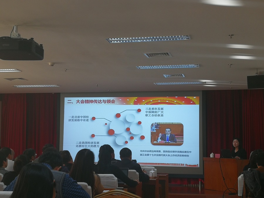 會上,中國工會十七大代表、全國總工會經(jīng)費(fèi)審查委員會委員、區(qū)總黨組成員、經(jīng)費(fèi)審查委員會主任蘇日娜作重要講話,傳達(dá)中國工會十七大精神,介紹自治區(qū)代表團(tuán)參會情況;自治區(qū)財貿(mào)輕紡農(nóng)牧林水工會工會主席云利平重點傳達(dá)習(xí)近平總書記同全總新一屆領(lǐng)導(dǎo)班子成員集體談話時的重要講話精神及總書記關(guān)于工人階級和工會工作的重要論述;中國工會十七大代表、恒泰證券股份有限公司人力資源部總經(jīng)理助理李菲菲作為主講人圍繞“中國工會十七大精神及個人學(xué)習(xí)體會”作主題宣講。李菲菲首先向與會人員詳細(xì)的介紹了十七大主要議程,隨后傳達(dá)了大會精神,并結(jié)合工作實際談了個人感受。