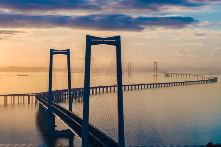 2024年6月27日,沐浴在晨曦中的深中通道(無人機(jī)照片)。新華社記者毛思倩 攝